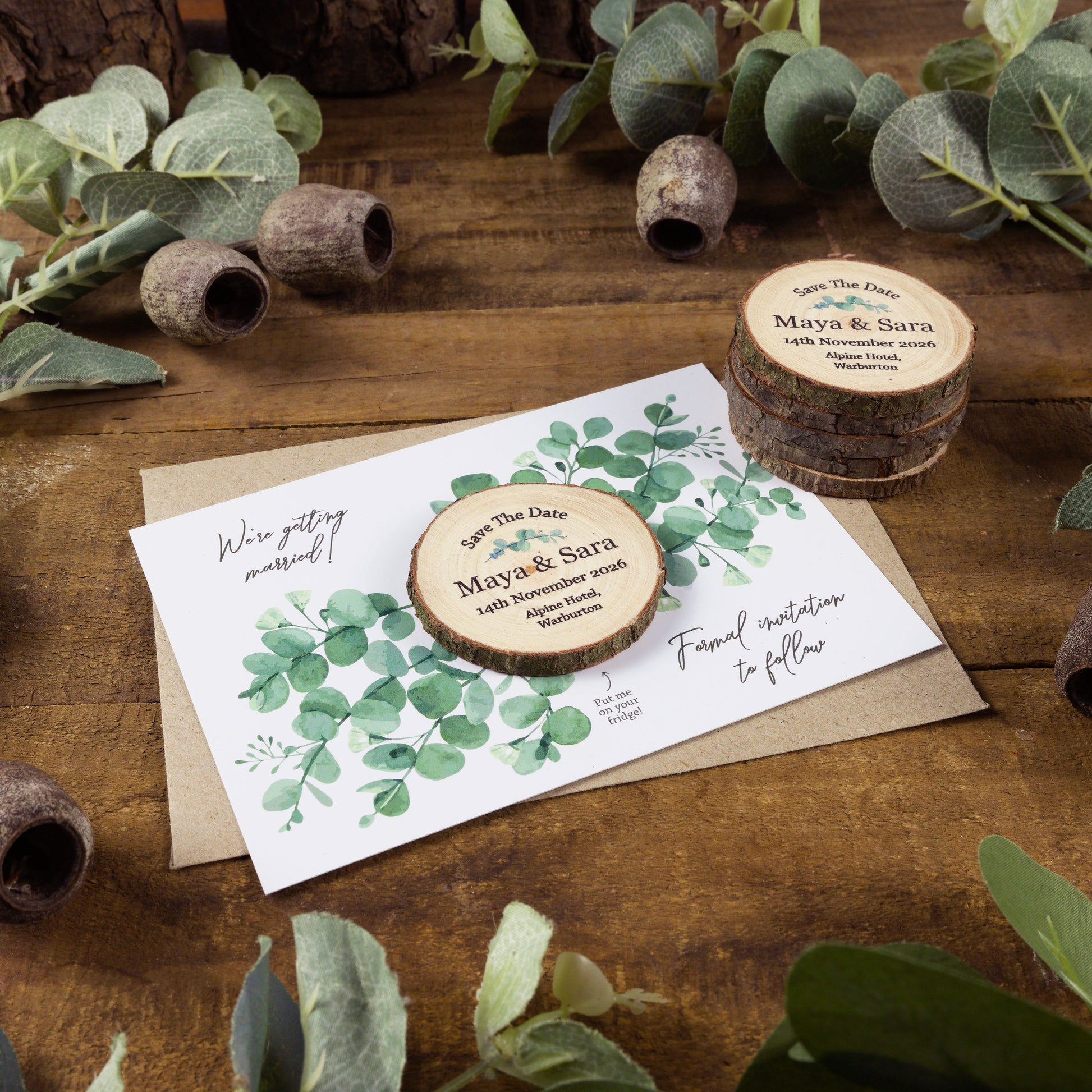 This save the date is designed to pair with our eucalyptus wood slice design for a cohesive look.