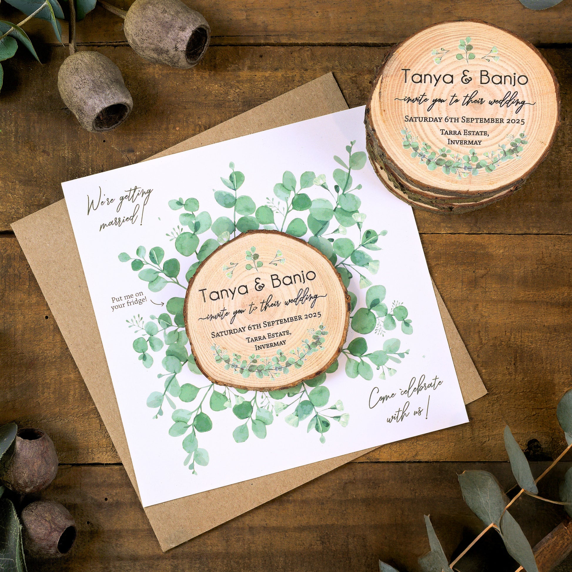 A truly unique wedding invitation printed on a real wood slice — designed to surprise and delight your guests the moment they open the envelope. Finished with a soft eucalyptus design, it offers a calm, natural aesthetic with a distinctly Australian feel.
