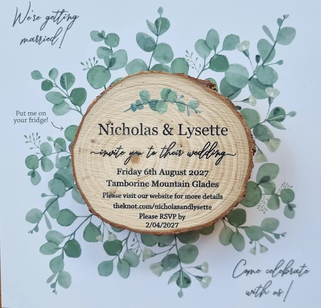 A truly unique wedding invitation printed on a real wood slice — designed to surprise and delight your guests the moment they open the envelope. Finished with a soft eucalyptus design, it offers a calm, natural aesthetic with a distinctly Australian feel.